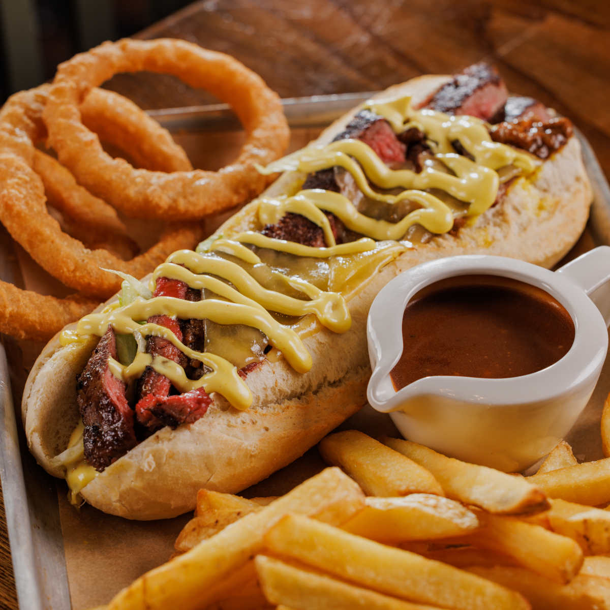 Ultimate steak dipper, steak, melted cheese and rich beef gravy in a crusty baguette, with crispy onion rings, chips and a pot of gravy for dipping | 14.49 1886 kcals