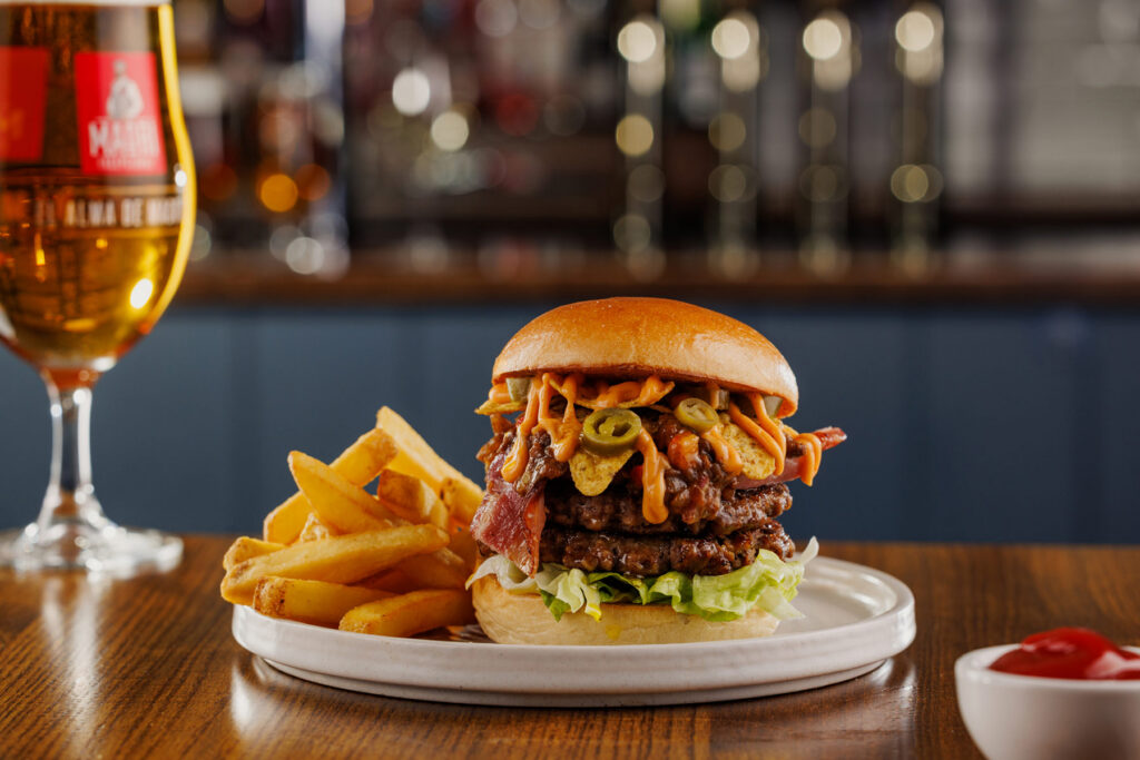 Classic burger, two 3oz beef patties with burger sauce. Served in a toasted brioche-style bun with chips | 12.49 1378 kcals